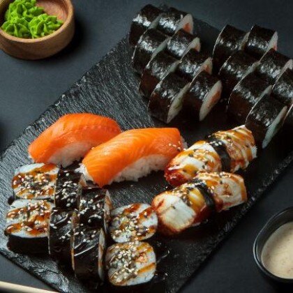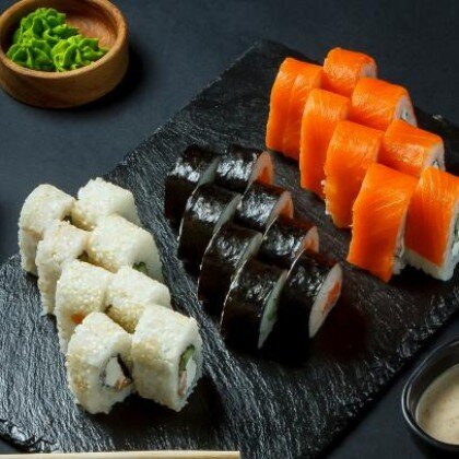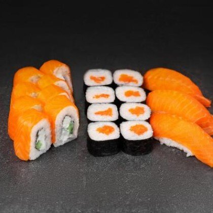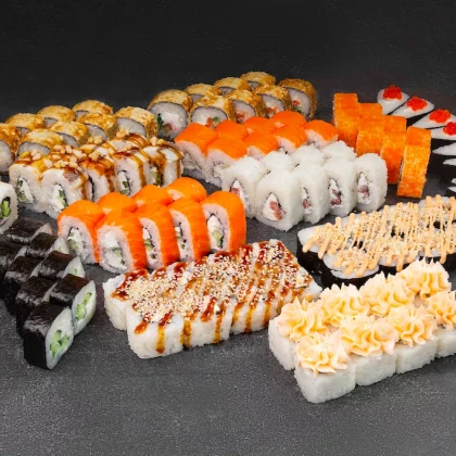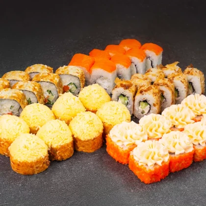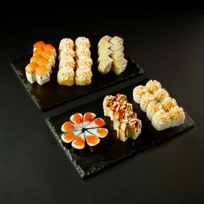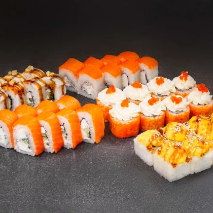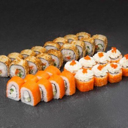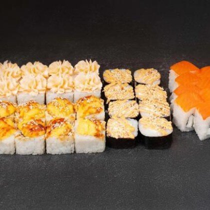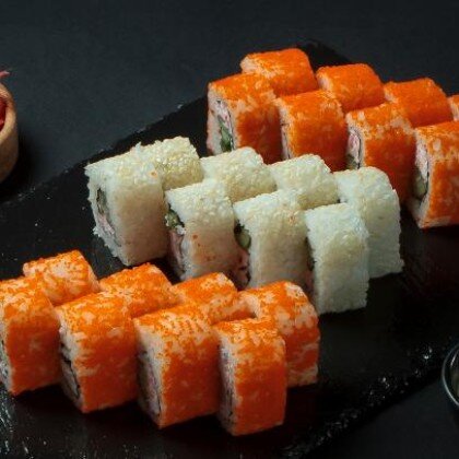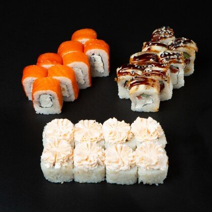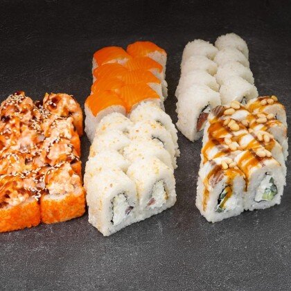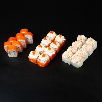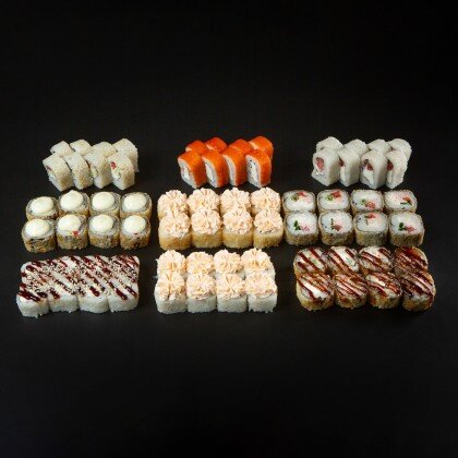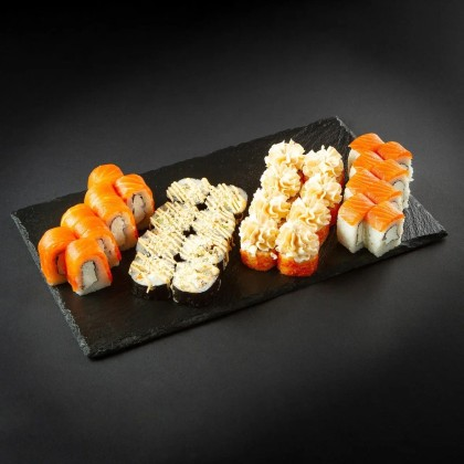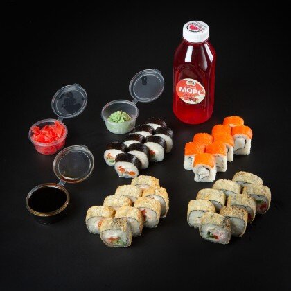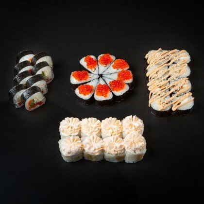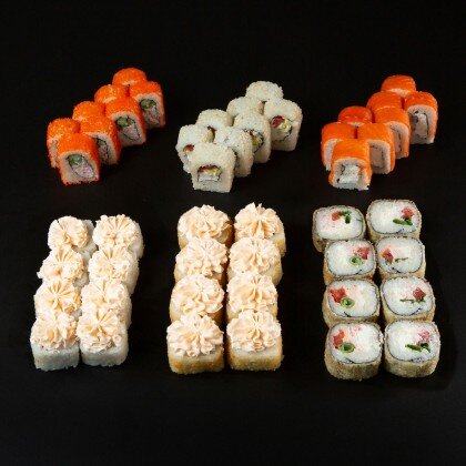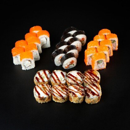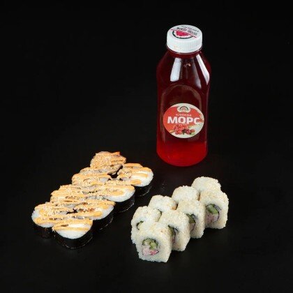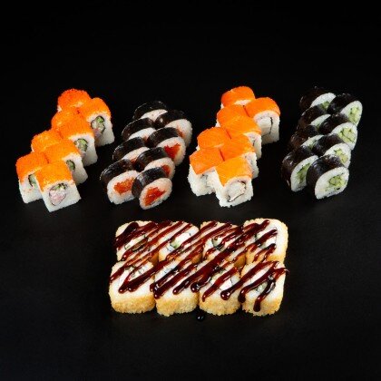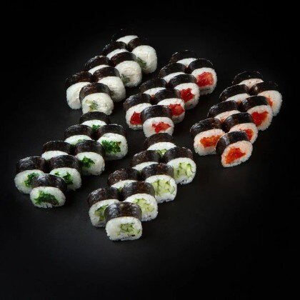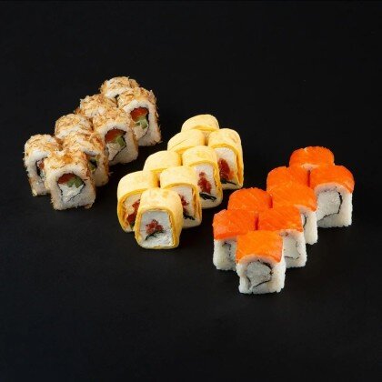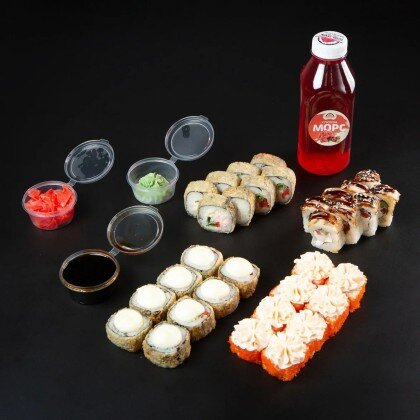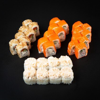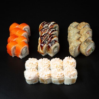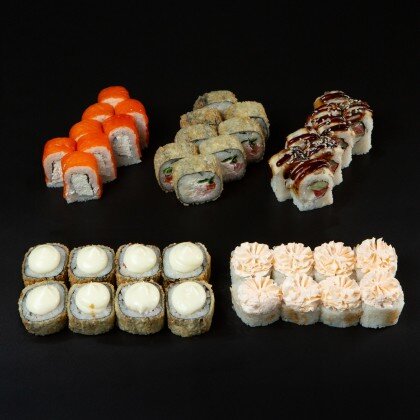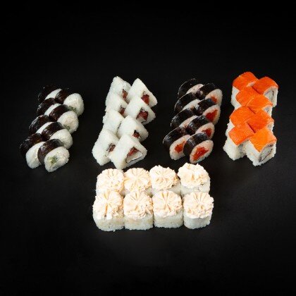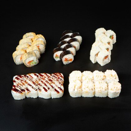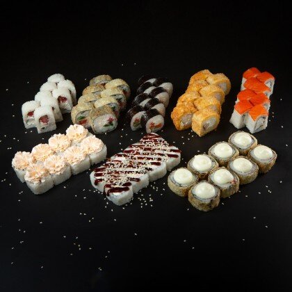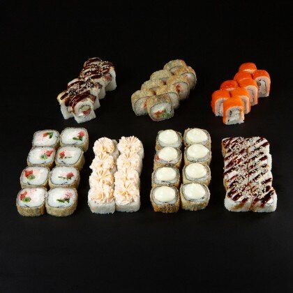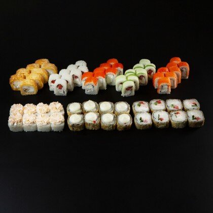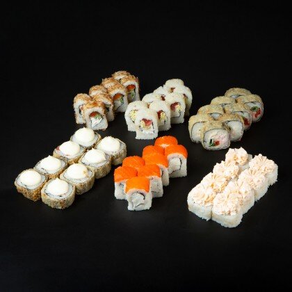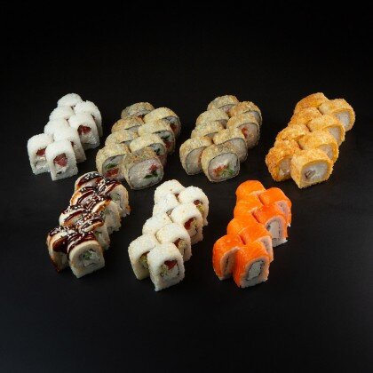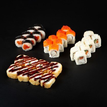 Калифорния Лайт (8 шт.), Кани Темпура (8 шт.), Каппа Фила (8 шт.), Лава с крабовым мясом (8 шт.), Темпура Тортилья (8 шт.), Филадельфия Лайт (8 шт.),. Филадельфия Лайт с угрем (8 шт.).