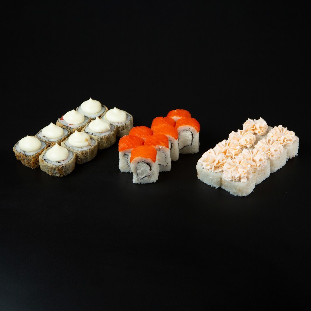Лава с крабовым мясом (8 шт.), Тори Темпура (8 шт.), Филадельфия Лайт (8 шт.).