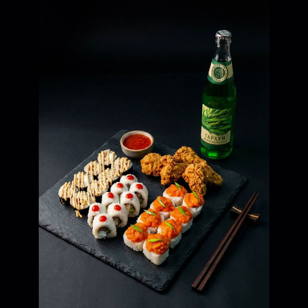 Ролл спайси, острый ролл с тунцом, фреш ролл, острые крылышки, соус шрирача, тархун